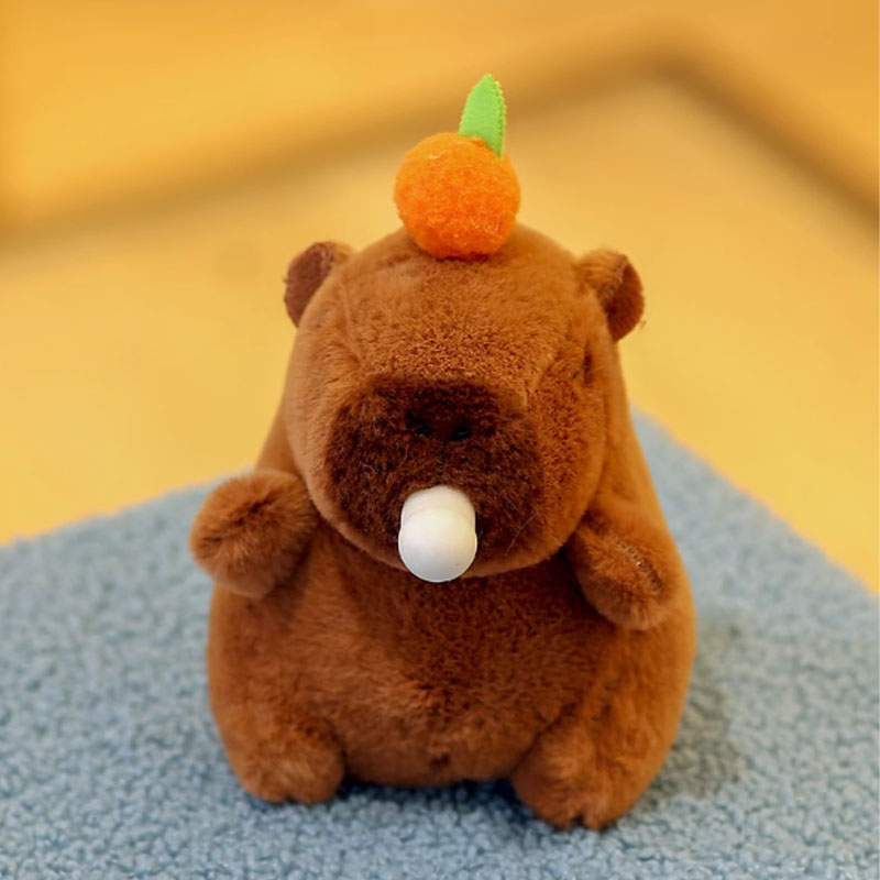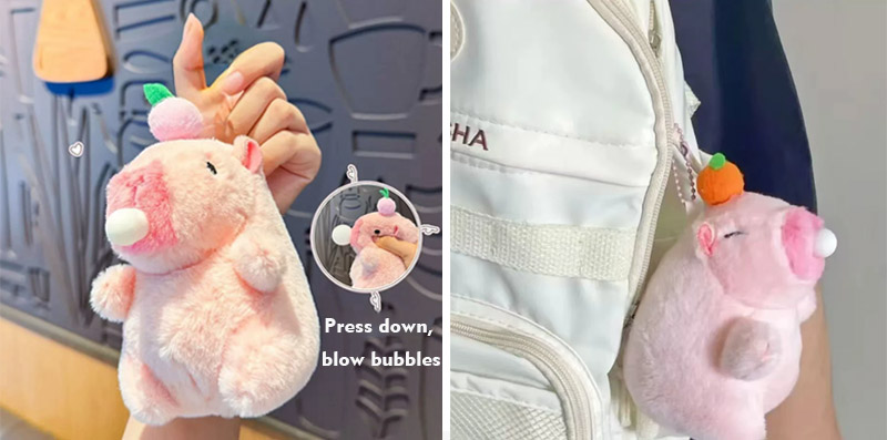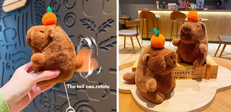 Z Kapybary jako głównym projektem, obraz pokazuje pluszową formę Capybara. Ten pluszowy materiał może lepiej reprezentować wygląd Capybara, a ogólny obraz jest wyjątkowo uroczy. Na ich głowach znajdują się różne owoce, takie jak persimmony, brzoskwinie i jabłka, a ich oczy. Ten pluszowy brelok ma również funkcję interaktywną. Dopóki ciągniesz linę, jego ogon może się obracać. Kiedy szczypisz jego twarz, może wydmuchać bąbelki, a podczas dmuchania bąbelków może nawet wydawać dźwięki. Jego unikalne umiejętności mogą skuteczniej przyciągnąć klientów i zdobyć ich korzyść.