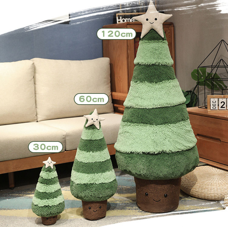 Ta pluszowa zabawka choinki jest bestsellerem na Boże Narodzenie. Występuje w czterech stylach i trzech rozmiarach zabawek: 30 cm, 60 cm i 120 cm. W razie potrzeby można wybrać rozmiar choinki. Można go umieścić w różnych pozycjach. Na przykład 30 cm można umieścić na samochodzie lub na oknie wykuszowym. Większy można umieścić w salonie jako dekoracja wakacyjna. Niektóre małe ozdoby można również ozdobić na choince, która jest bardzo świąteczna.