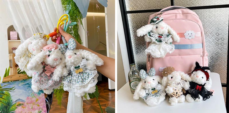 Możesz kupić zwykłego królika, który jest bez akcesoriów i kostiumów. Nasze pluszowe breloki zwierząt występują w różnych stylach. Można je dopasować do różnych rodzajów ubrań i akcesoriów, a istnieje wyjątkowo szeroki wybór. Ten pluszowy wiszący ornament jest kochany zarówno dzieci, jak i wiele dziewcząt.